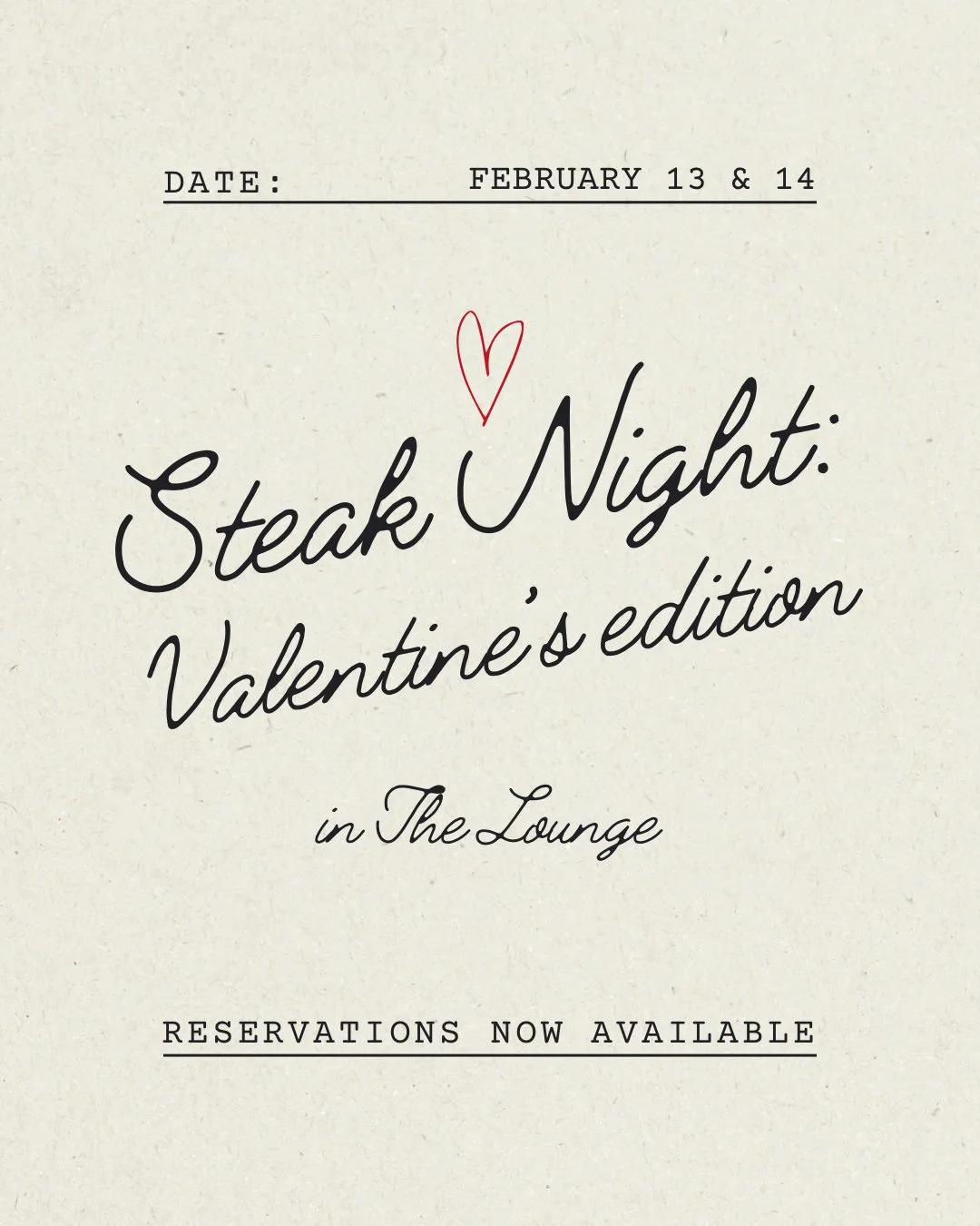Join us for Steak Night in The Lounge: Valentine’s edition! This coursed dinner is crafted in the spirit of love and togetherness and highlights some of our favorite steakhouse gems, the Lodgepole way.